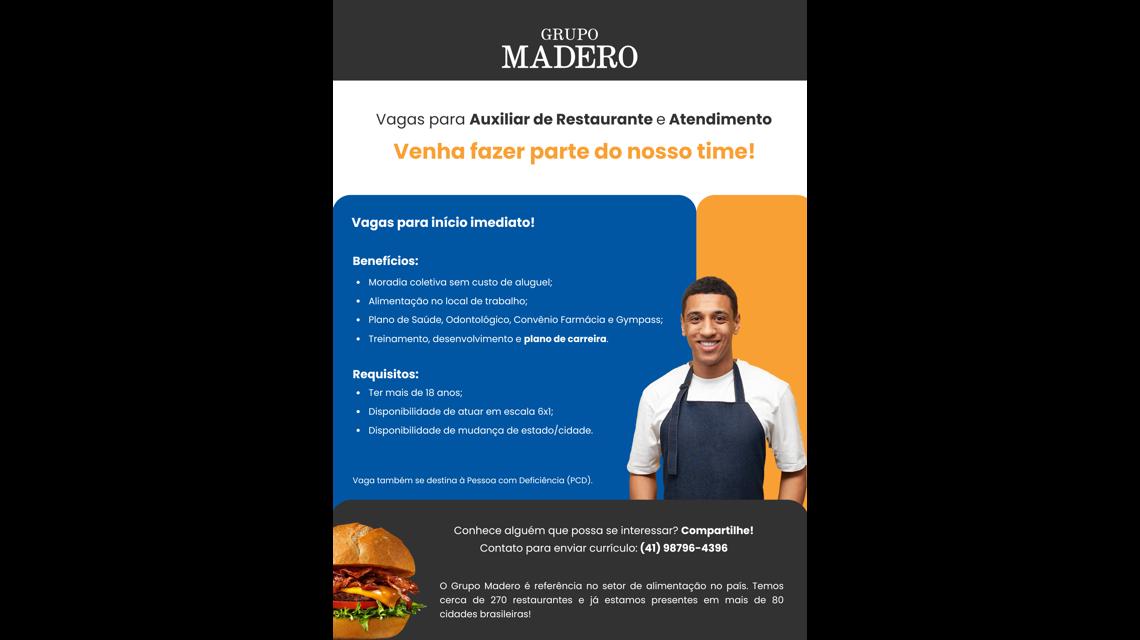 O Grupo Madero, reconhecido como uma das maiores redes de restaurantes do país, está em busca de um Auxiliar de Restaurante. Se você é apaixonado por gastronomia e possui habilidades em atendimento ao cliente, essa pode ser a oportunidade que você estava esperando!